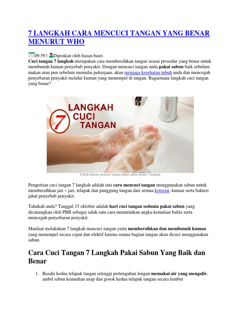 7 langkah cara mencuci tangan yang benar menurut who cuci tangan 7 langkah merupakan cara membersihkan tangan sesuai prosedur yang benar untuk membunuh kuman penyebab penyakit. Terdapat pelbagai kaedah yang disarankan untuk mencuci tangan seperti cuci tangan kkm ataupun berdasarkan garis panduan pertubuhan kesihatan sedunia who. Omar hana tutorial cara cuci tangan yang betul covid 19 youtube. Dengan mencuci tangan anda pakai sabun baik sebelum makan atau pun sebelum memulai pekerjaan, akan menjaga kesehatan tubuh anda dan mencegah penyebaran penyakit melalui kuman yang menempel di tangan.… Cuci tangan 7 langkah merupakan cara membersihkan tangan sesuai prosedur yang benar untuk membunuh kuman penyebab penyakit.