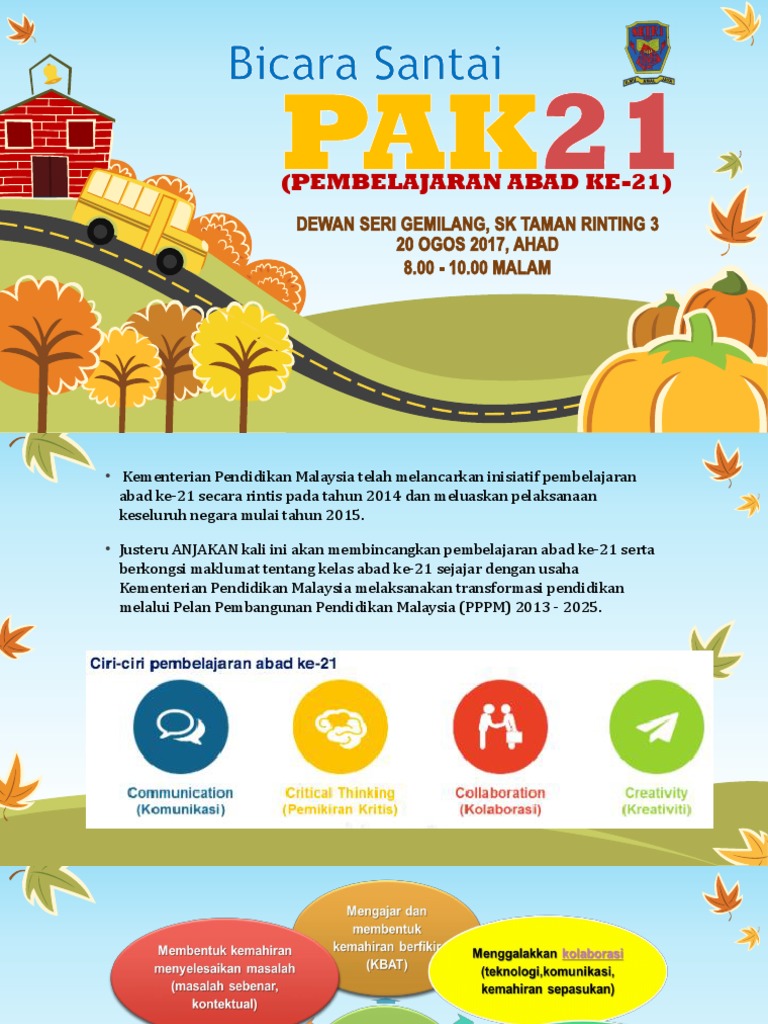 Kota Tinggi Showcase Satu Aspirasi Pendidikan Abad Ke 21 from www.jprisma.com Pembelajaran abad 21 adalah pembelajaran yang dirancang untuk generasi abad 21 agar mampu mengikuti arus perkembangan teknologi terbaru. Penjelasan lanjut berhubung perkara ini bolehlah terus dirujuk ke bahagian kabinet, jabatan perdana menteri. 10:22 oxford university press elt recommended for you. Fikir atau tulis apa yang disoal oleh guru. 47 aktiviti ini sesuai dan boleh dilaksanakan dalam aktiviti pembelajaran dan pemudahcaraan (pdpc). Di bawah ini disertakan link untuk tuan/puan memuat turun 1. Perbezaan di antara pedagogi konvensional & alaf 21 dimensi konvensional alaf 21 1. Ruangan pertanyaan dan diskusi chat.
